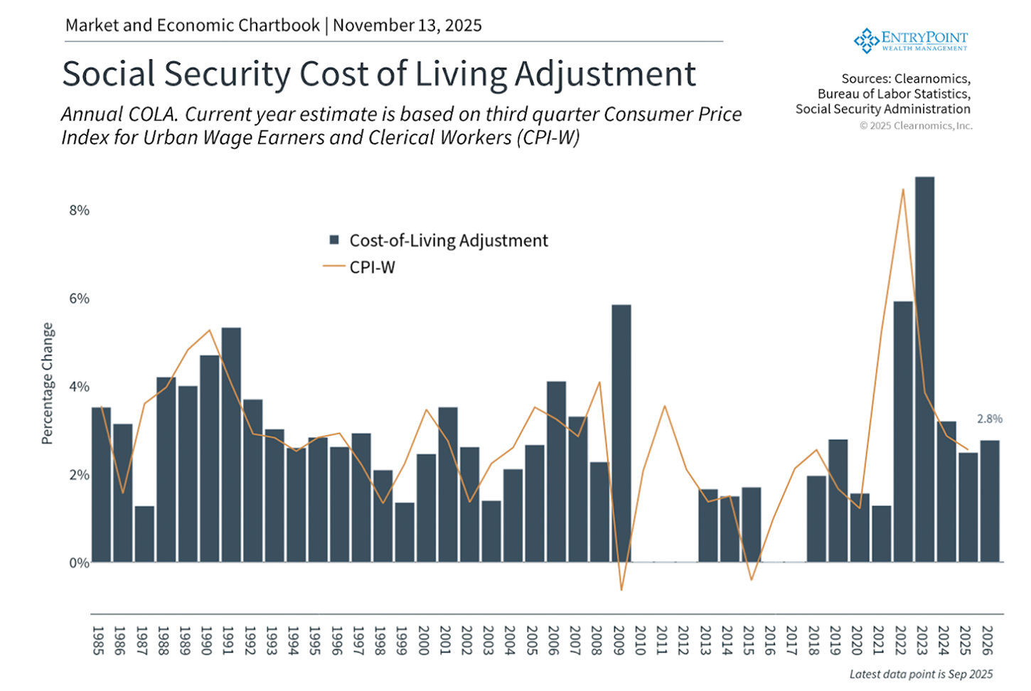 Annual COLA. Current year estimate is based on the third quarter Consumer Price index for Urban Wage Earners and Clerical Workers (CPI-W).
